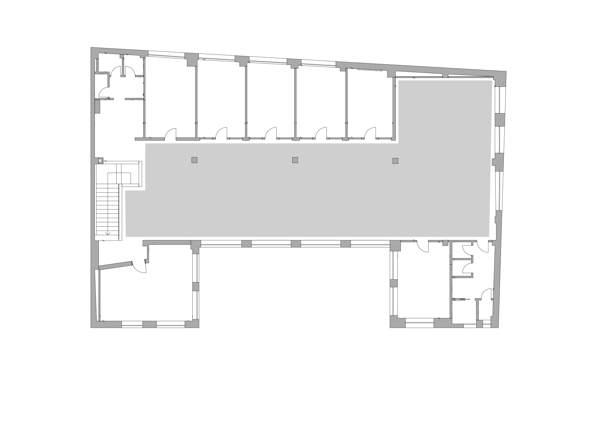Le aree di servizio comprendono due cucine, quattro blocchi bagno e locali tecnici dedicati, rendendo lo spazio completamente autonomo e versatile.